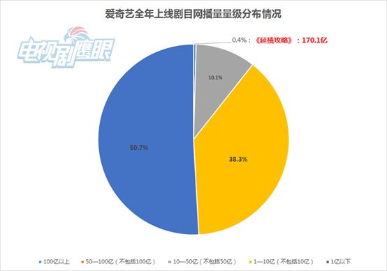 从网播量(注:爱奇艺于2018年9月3日宣布关闭显示前台网播量,故9月后数据不在统计范畴内)来看,“百亿阵营”仅《延禧攻略》一枝独秀,网播量在50到100亿区间的作品数量为0,头部流量断层明显,网播量未达到1亿的剧目占据半数以上。之所以出现数量与网播量倒挂现象,首先在于购买的版权剧没有完全发挥出台网联动效应,《天盛长歌》《凤囚凰》等古装大剧没有优酷和腾讯视频两大平台的分流,表现却未达到预期;其次在于腰部自制剧的发力不足。