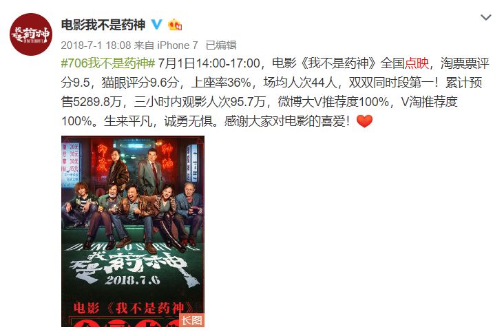 由影联参与发行的另一部爆款影片《我不是药神》,则更是享受到了提档的好处。该片原定于7月6日上映,但早在7月3、4日就举行了全国范围内的大规模点映,并选择在7月5日提前一天上映。虽然前置时间不久,但影片这短短几天里就多赚了3亿票房,此举也为影片口碑的进一步爆发奠定了基础。
