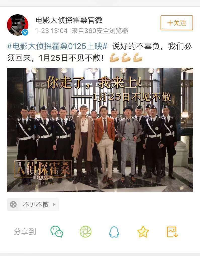 前几次改档,片方还给出了“技术原因”作为理由,但到最后一次,就直接把真实想法表露出来了:“你走了,我来上。”原来,原先定档于春节档的《情圣2》因为主演风波改档到了25号,为了躲避竞争,《大侦探霍桑》选择了撤档;后来《情圣2》撤档,失去重要对手的《大侦探霍桑》便立即选择了回归。