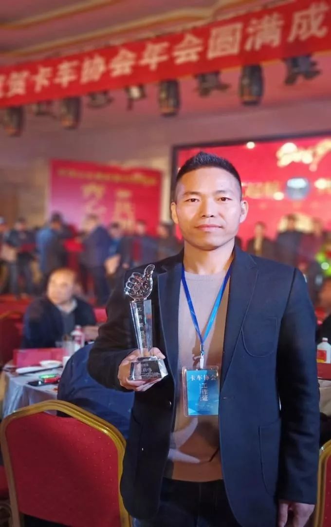分会长晓伟被被颁发了优秀管理奖,水晶奖杯上是竖大拇指的图案,他举着给我拍照。在激昂的颁奖音乐中,卡车司机们从T字台上场,被颁发荣誉证书。