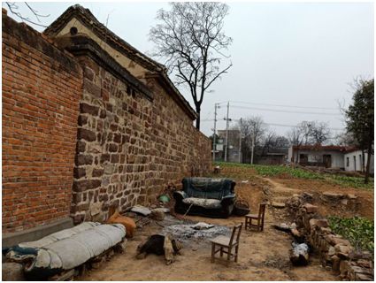 从瓦厂向南,步行路过干涸多年的水库,征地新修的火车道,十分钟就到400多口人的陈村。残垣断壁的老房子,很多复垦成耕地,东一块西一块,点缀在房屋间,起起伏伏。
