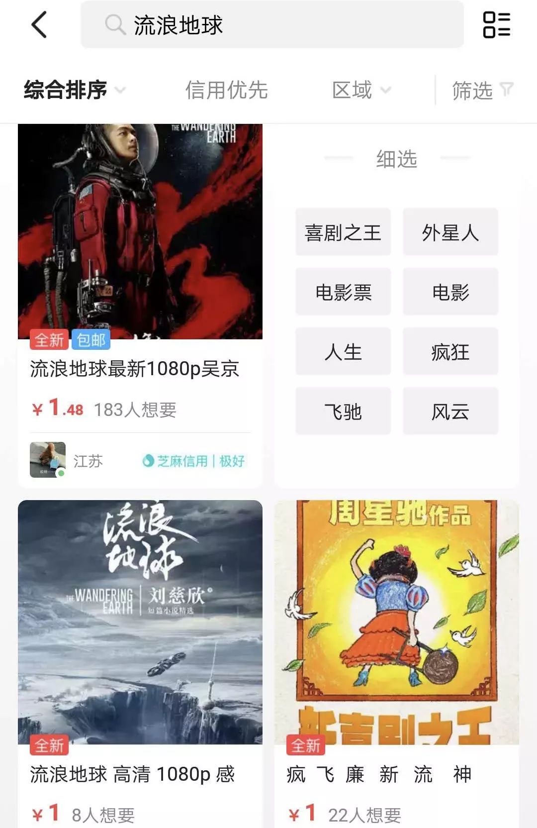 微信微博、QQ贴吧、三无网站、百度云盘、手机APP、闲鱼二手,是盗版资源的活跃区,其实只要有网络空间,盗版资源就能快速传播。在闲鱼,一部春节档影片价格在1.5-5元,甚至也有组合影片大礼包的方式售卖。