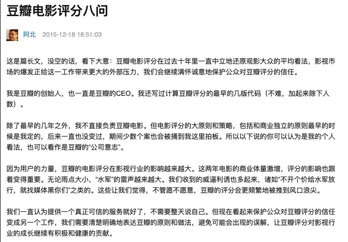 对于这些乱象,豆瓣创始人阿北此前曾在《豆瓣电影评分八问》一文中做出过一些解释,他强调豆瓣刷分是一件成本大、收效小的事情,且豆瓣有相关机制来过滤掉水军。此外,近年来豆瓣为了限制刷分,还调整了映前打分机制,电影正式上映前评分都将不予以显示。