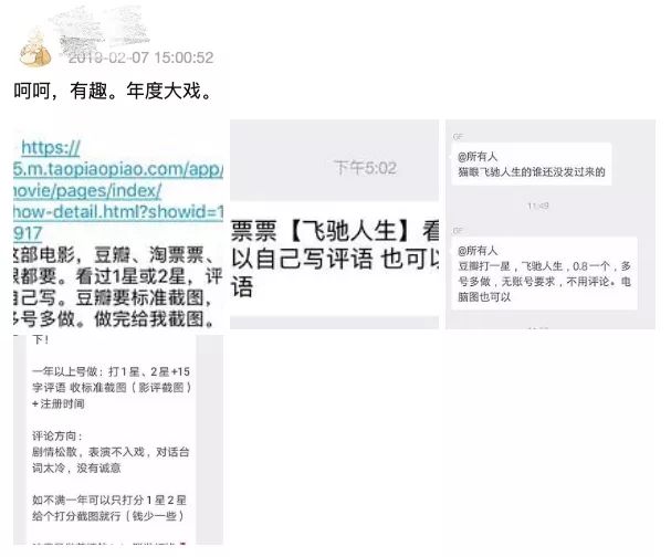 春节档前后,不断有网友晒出群聊截图,曝光春节期间的影片刷分或者互黑行为。一位加入了刷分群的网友向毒眸证实,这种群的确存在,并在春节期间“任务量激增”,注册满半年以上的豆瓣账号,只要按照要求给相关影片打低分或者高分并附带15字评论,就能获得每条几毛到几元不等的红包。
