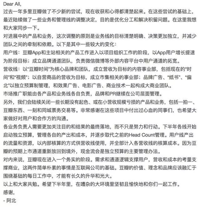 到了2017年,出于自身发展需求,豆瓣开始对公司战略进行进一步调整。在当年8月的内部信《年中业务调整》中,阿北明确提出将分为用户线和营收线两条业务线,其中用户线就是以“APP用户增长提速为阶段目标”。而也是在近几年,包括豆瓣观影团等一些原本只集中在北上广的活动,也开始去往一些三四线城市。