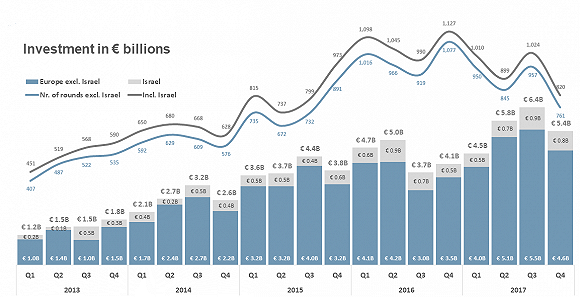 欧洲风投总规模在过去数年内迅速增长,但和中美的差距依然巨大。图片来源:dealroom