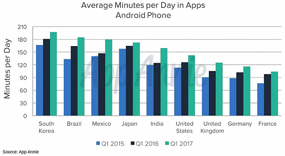 各国用户每日打开的app数量,法国的数据明显落后于其它大国。图片来源:app annie