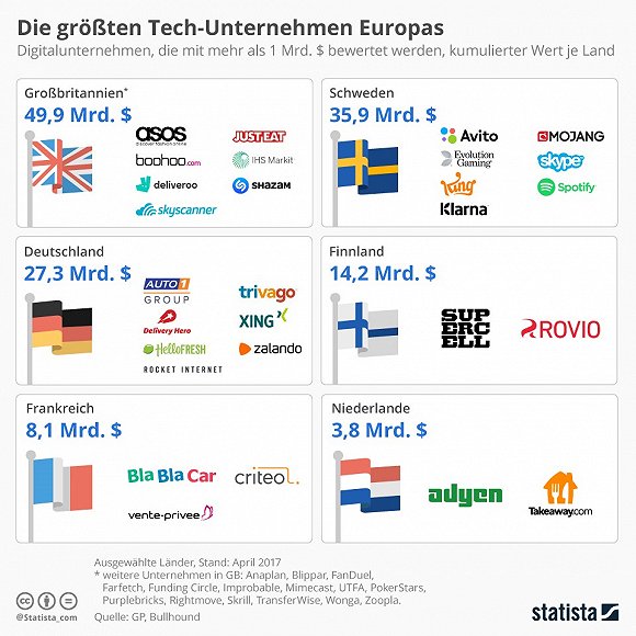 2017年欧洲各国全国所有科技创新企业的估值/市值总和列表。腾讯4346亿美元可以匹敌英国全国。