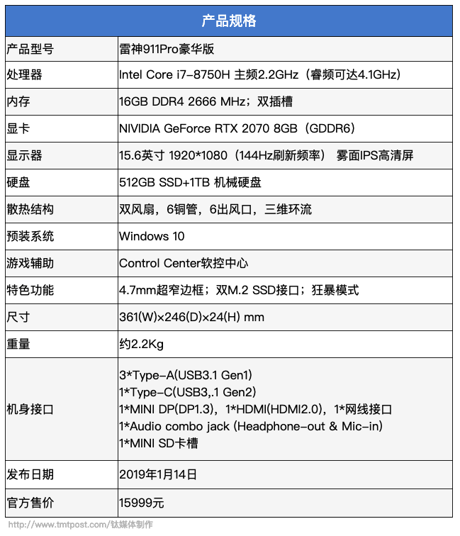 近日,钛媒体就收到了雷神911 Pro豪华版(后文简称:雷神911 Pro),相比于之前我们测试的RTX 2080独立显卡,RTX 2070在移动平台上会有怎样的表现呢?