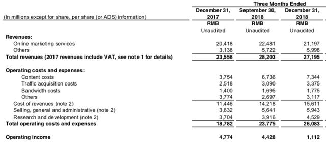 2018年Q4线上广告增速变缓,内容支出急剧增加(摘自百度财报)