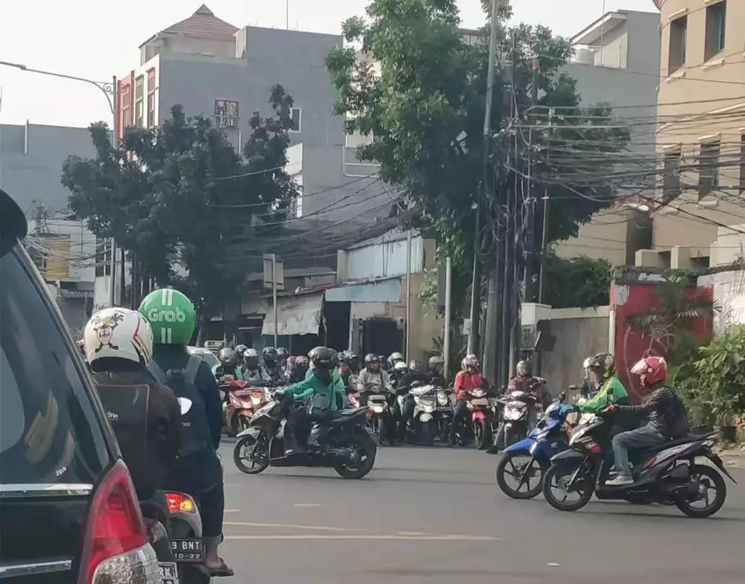 雅加达一路口等红灯的摩托车大军。 / 摄于印尼雅加达请输入图说