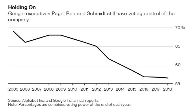佩奇和布林进一步退出了人们的视野和公司的日常运营。施密特于2018年初辞去了执行主席的职务。同时,根据Alphabet最新的年度报告,他们仍然控制着该公司,持有56.5%的投票权。