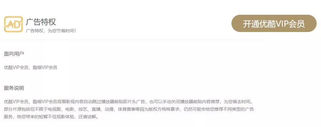 优酷的VIP会员也将“免广告”改为“跳过广告”