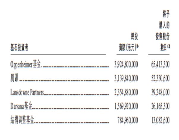 美团IPO时共有5家基石投资者获分配共约15亿美元(117.8亿港元),占今次新股发行总规模约三分之一,这5家基石投资者包括腾讯、Oppenheimer、Lansdowne、Darsana及诚通基金。腾讯作为美团上市的基石投资者之一,除了认购约4亿美元,也通过微信及QQ为美团提供流量支持。