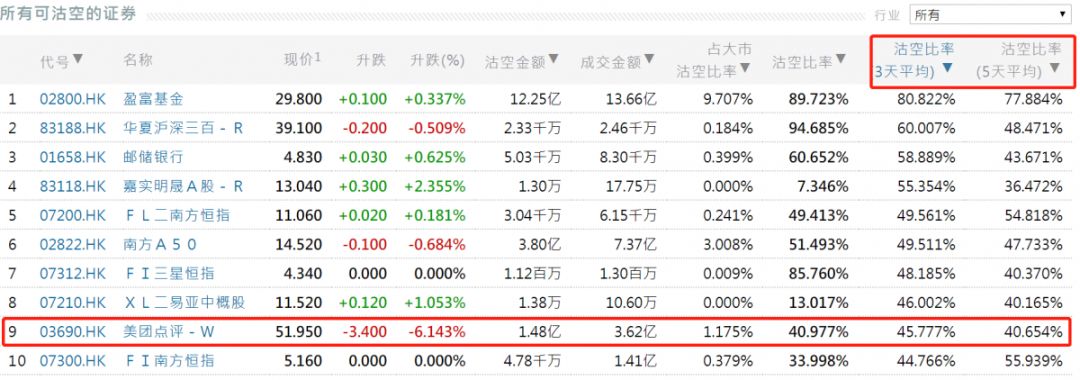 图:美团点评沽空比率(3天平均/5天平均)位居港股大市沽空前列,数据来源:阿斯达克财经