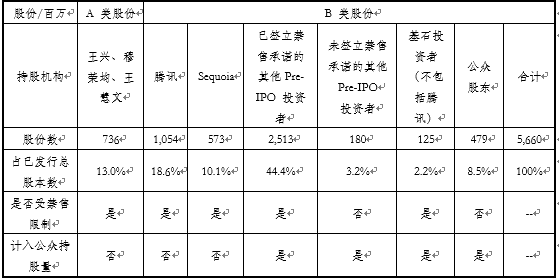 根据美团招股书,IPO时公司股票分为A、B两类。A类股票一股投票权相当于B股十票。三位创始人王兴、穆荣均、王慧文持有全部A类股票。