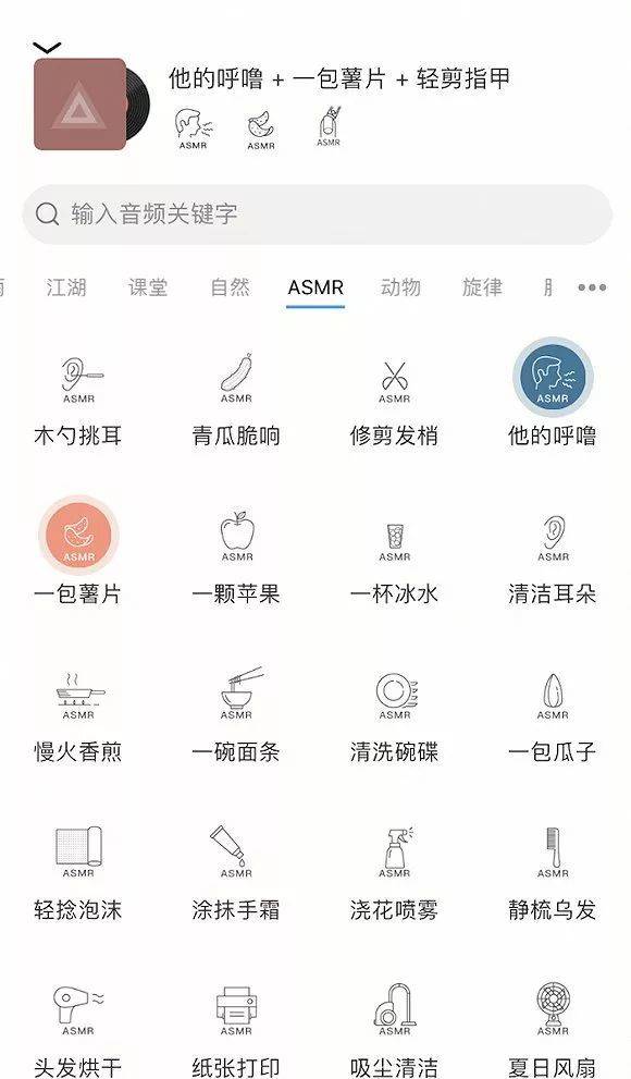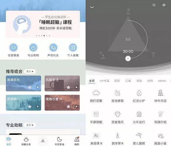小睡眠APP中除了包含传统的雷雨、江湖、自然等舒缓音效,ASMR也是一个受年轻用户喜欢、传播度很高的音效类型。