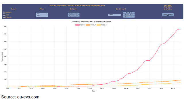进入第一季度,特斯拉认为欧洲和中国的Model 3需求将抵消美国的需求气穴。也就是说,欧洲和中国的需求大大低于预期。分析师预计特斯拉2019年第一季度将在欧洲销售超过2.5万辆Model 3 型汽车,但实时数据显示,该公司正朝着接近1万辆汽车的方向发展。截至3月16日,特斯拉在挪威、荷兰和西班牙(拥有每日注册数据的欧洲市场)共售出3821辆Model 3,457辆Model X和291辆Model S。注: 2018年荷兰是特斯拉在欧洲的最大市场,挪威是特斯拉在欧洲的第二大市场。