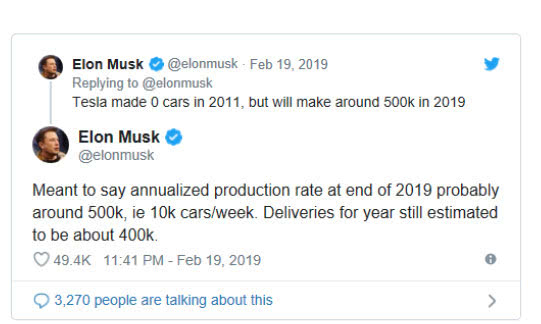 今年2月19日,马斯克发推文称特斯拉2019年将制造约50万辆电动车。相比较而言,该公司在此前发布的致股东信中曾表示,2019年的电动车交付量约为36万辆至40万辆。据推测,在与特斯拉的“推特保姆”疯狂交谈后,马斯克更新了他的评论以澄清评论。