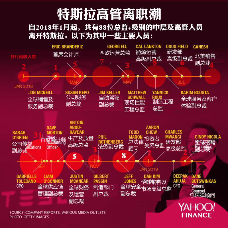 最近几个月,特斯拉的高管更替率呈指数级上升。随着前总法律顾问戴恩·布特斯温卡斯和前首席财务官迪帕克·阿胡贾最近高调离职,人员流动尤其集中在法律和财务部门。你可以在这里找到特斯拉高管最近离职的名单。据路透社报道,自2016年以来,40名“高级”特斯拉高管已经离职,而雅虎财经仅在2018年就将这一数字定为88人。