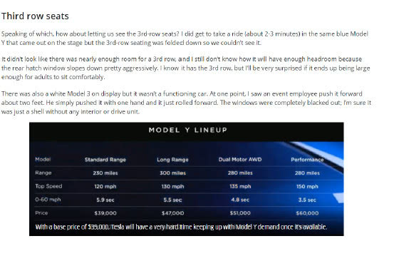 特斯拉发布的Model Y与Model 3非常相似,只有几处微小的变化。马斯克似乎对Model Y的发布仪式完全不感兴趣,甚至懒得展示车门或第三排座椅,这是Model Y唯一的区别于Model 3的两个地方。事后测试驾驶汽车的人清楚地注意到第三排座位不适合任何成年人。在大多数试驾中,特斯拉保持第三排座椅向下折叠,这样试驾者就看不出第三排座椅不是为成年人设计的。