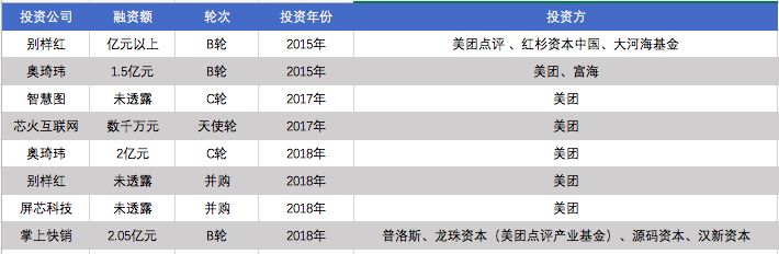 根据全天候科技的不完全统计,从2015年至今,美团在整合餐饮业上下游方面投资的案例至少有8起,涉及餐饮数据、室内定位、软硬件等众多领域,屏芯科技、智慧图、奥琦玮、等公司都被纳入美团版图。