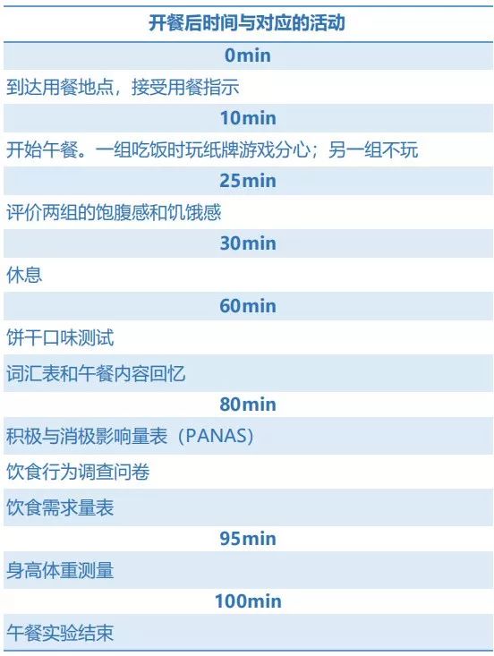 100 分钟,用看一部电影的时间吃了一顿午饭。其中,实验组的人边吃午餐边玩掌上纸牌游戏,而对照组则正常吃饭。