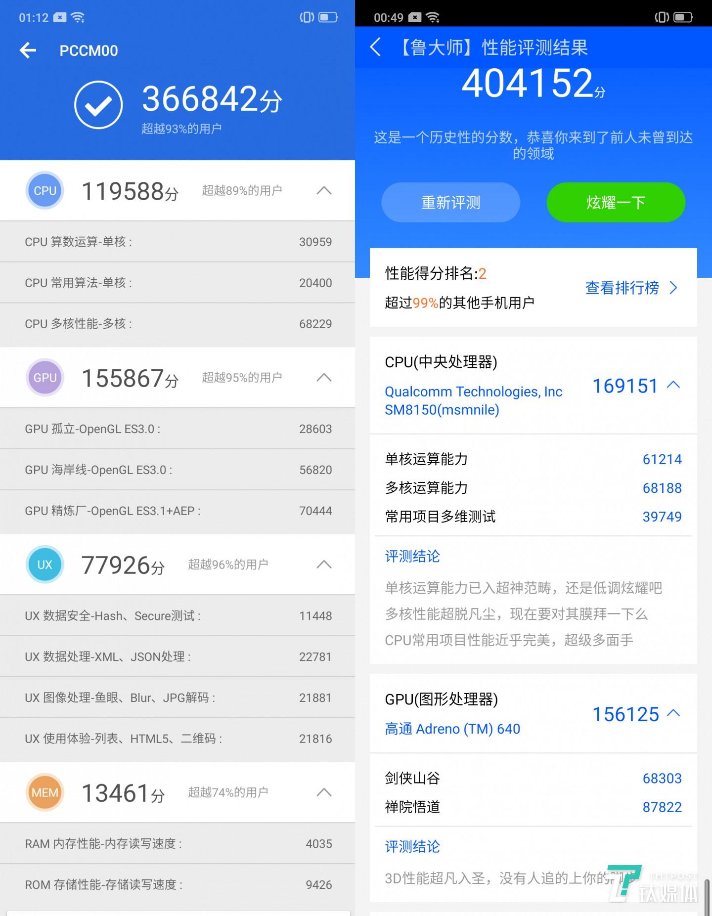 我用安兔兔和鲁大师两款性能测试APP对其进行了跑分测试,前者得分为36.6万(排行第三),而后者跑分也为40.4万(排行第二)。这样的跑分结果相当强悍,甚至要高于一些主打性能的游戏手机。