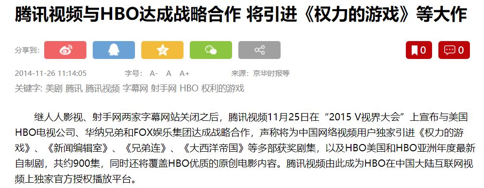 搜狐受挫之后,各视频平台的美剧势力重新洗牌。随着整改结束海外剧通道逐渐放宽,对流媒体美剧第一宝座虎视眈眈的腾讯视频开始觊觎美剧独播权。2014年底,腾讯视频跟HBO达成合作,拿下了包括《真探》、《兄弟连》等在内的约900部剧集,包括一些尚未播出的内容,“权游”从此也以正版形式落入腾讯麾下。