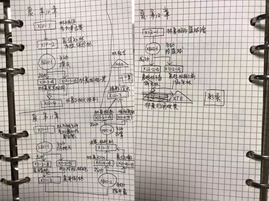 当然,国内的互动剧不管在体量还是复杂程度上都还算是1.0时代,但也远比普通的剧本要来的复杂。偶像恋爱互动剧《拳拳四重奏》的项目发起人、联合出品人武瑶向剁椒娱投展示了其中一个章节的剧情逻辑图,“这里分了普通选项、互动选项、循环选项,分支剧情、隐藏剧情,不同解决线等,它很像一个电路图或者数学算法图,不过一般做过游戏策划和设计的人应该很快能看懂。”