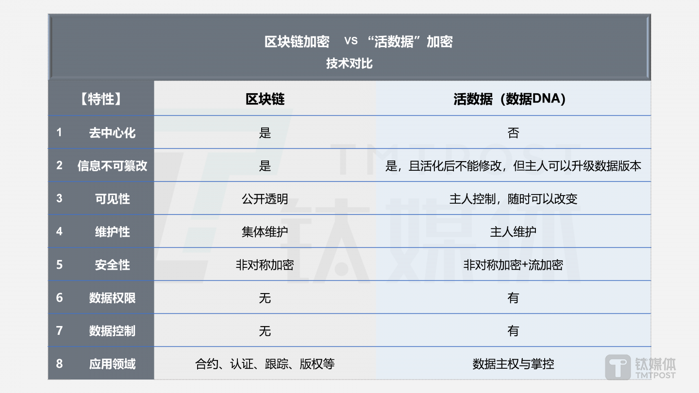 区块链加密技术和“活数据”加密技术的参数对比(制图/钛媒体,丛笑)