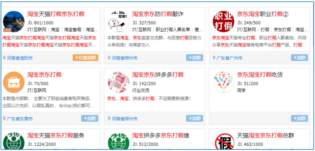 在QQ搜索“打假”,会出现密密麻麻的各种打假群,其中不乏付费群以及一些规模达千人的大群。