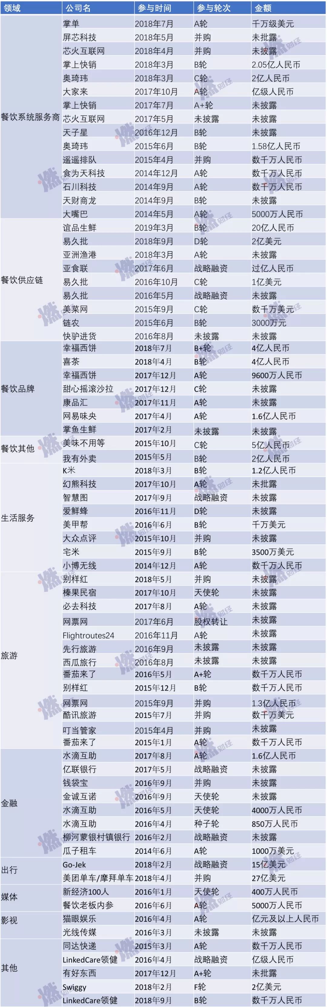 纵观美团近年来的投资情况,与其战略高度协同。这种协同表现为:上市之前,美团一直不设边界,因此其投资业务也涉及出行、新零售、酒店、旅游、金融等多个板块;而上市之后,美团宣布聚焦于“吃“,即餐饮+平台,整个2018年其他板块的投资几乎停滞。