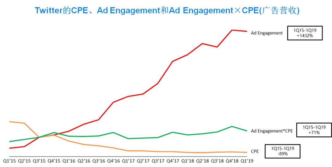 1Q15-1Q19 Twitter的CPE、Ad Engagement和广告营收