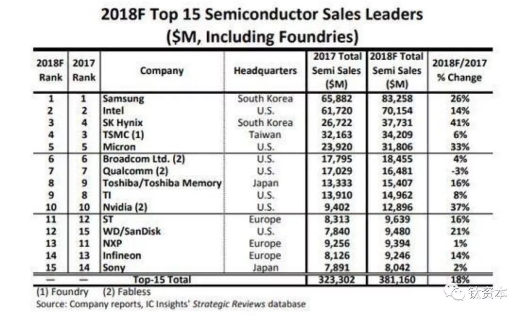 从另一个维度看,榜单里有很多家是IDM模式,也就是既有芯片设计,也有自己的生产线,像top2 的Intel、三星、还有另外的ST、NXP等几家公司也是有自己的生产线的;高通、博通、NVIDIA都是Fabless模式,也就是只做芯片设计,而将芯片的制造外包出去。