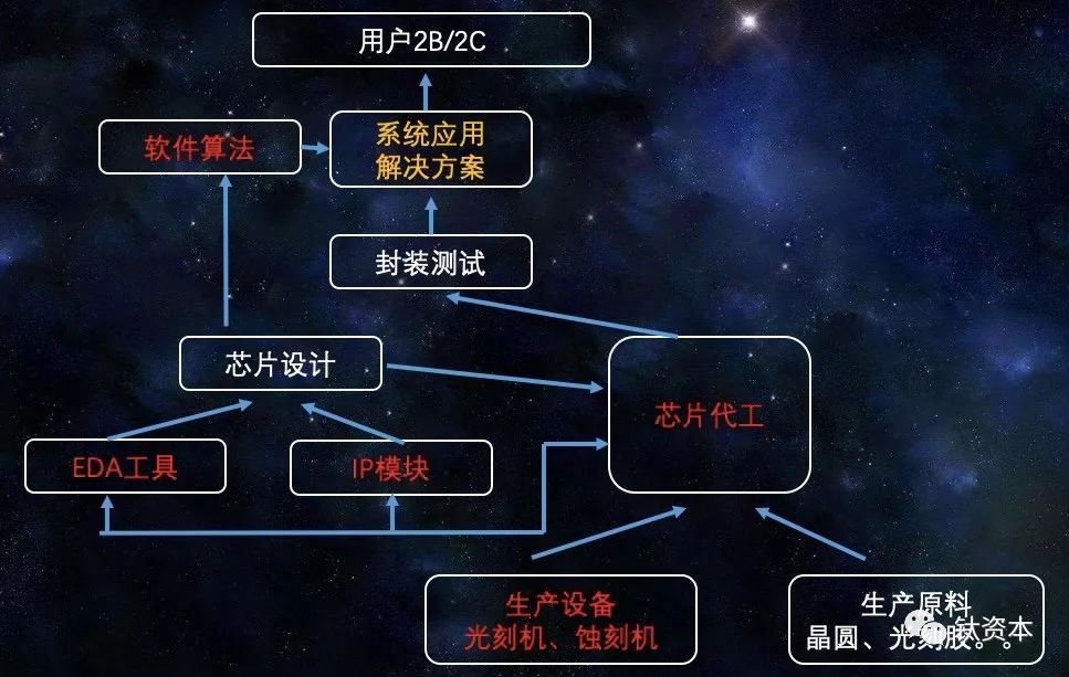 结合中国目前的现状,上图中用白色标出来的是不需要担心的。中国是全球最大的市场之一,最不缺的就是用户了。封装测试在中国也有不错的基础,芯片设计虽然在排行榜中排前十的不多,但至少有一两家公司。
