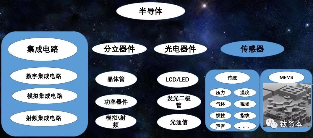半导体大致可以分成几个大类:第一类是传感器,包括传统的传感器和MEMS(微机电系统)传感器,传统的传感器包括压力、温度、气体、磁场、惯性、指纹、声音等传感器,MEMS工艺可以做得更小;第二类是光电器件,包括现在常用节能灯上的发光二极管,以及电子面板如手机或电视面板,包括华为折叠屏手机用面板也属于半导体器件;第三类是分立器件,包括晶体管、功率器件、模拟或射频;第四类是集成电路,包括数字集成电路、模拟集成电路、射频集成电路。