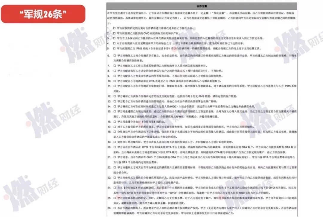 此外,2.0模式还显示出了OYO对业主的强控制。业主一旦签约,需要遵守新版合同,该合同在内部被称为“军规26条”。内部人士对燃财经表示,部分业主认为这涉嫌霸王条款,因而推进缓慢。