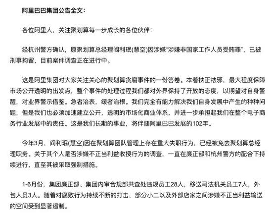 阿里巴巴发布公告宣布阎利珉被刑拘