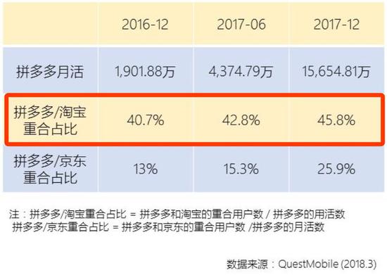 数据亦印证了这一观点。根据QuestMobile大数据呈现的《拼多多用户研究报告》显示,在所有电商平台中,拼多多和淘宝用户重合度最高,2017年底,约有45.8%的拼多多用户同时也是淘宝用户,且这一比例呈现上升趋势。
