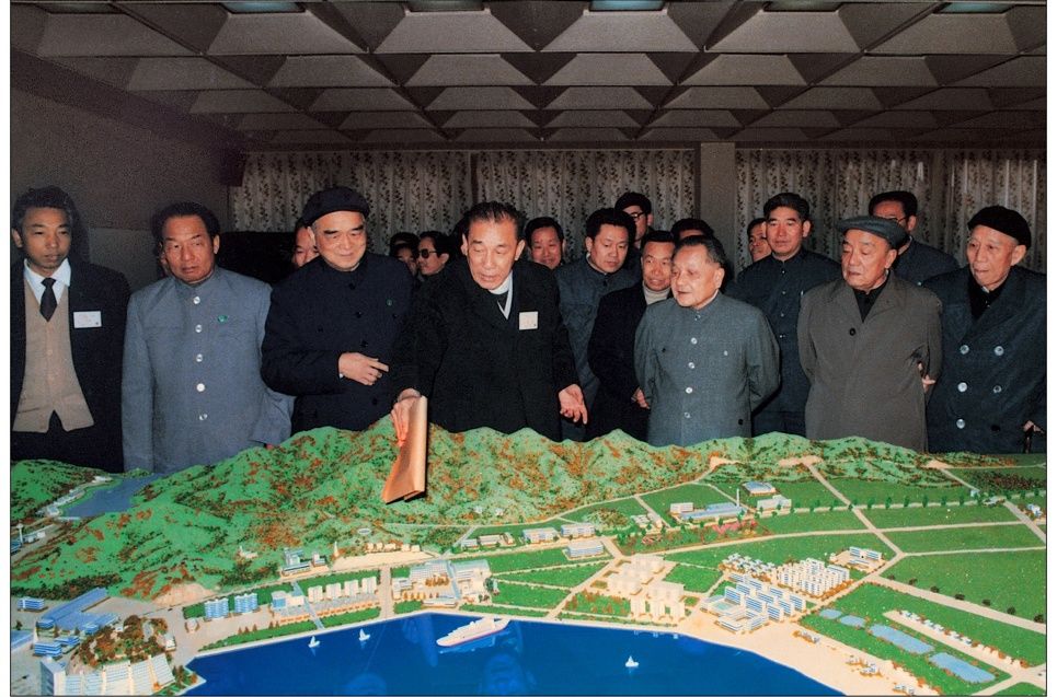 1984年1月26日,邓小平、王震、杨尚昆等中央领导视察蛇口工业区,在沙盘前听取袁庚介绍招商局蛇口工业区的规划