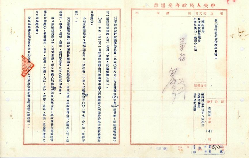 随着1951年招商局总公司更名为中国人民轮船总公司,及内地各分支机构相应更名,“招商局”的名称在内地不复存在。只有香港招商局和台湾招商局仍保留“招商局”的名称继续发展。从此,招商局这一古老的民族企业,干分两枝,在海峡两岸分别发展,直到1995年台湾招商局与阳明海运合并,百年招商局以香港一枝续写历史的重任。