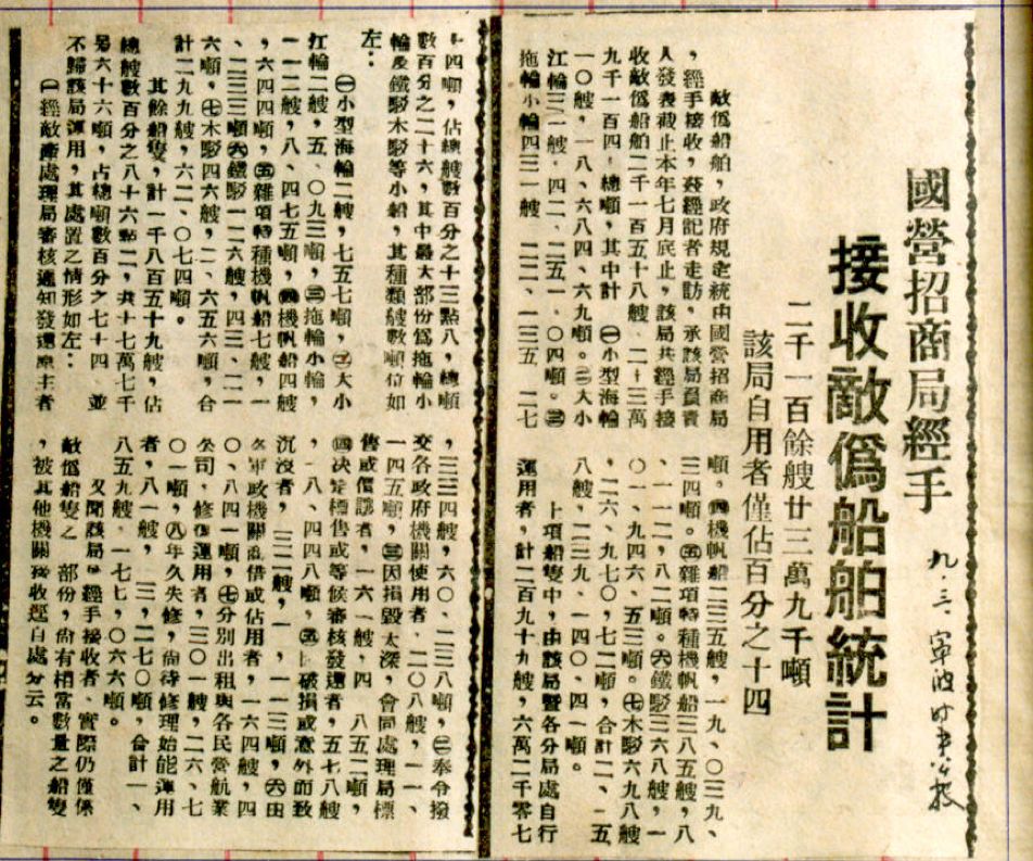 刊登在宁波时事公报上的有关招商局经手接收敌伪船舶统计的报道