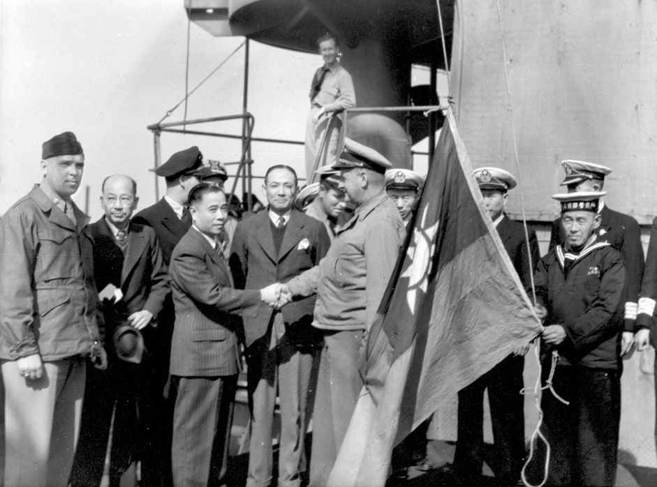 抗战胜利后国营招商局总经理徐学禹在接收美国剩余船舶的仪式上