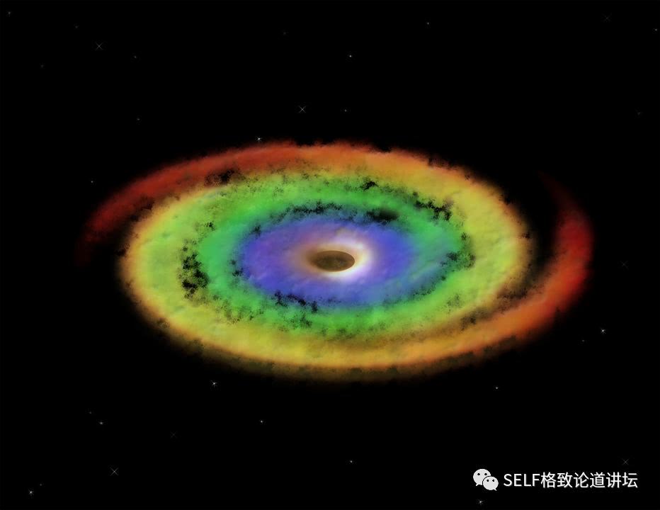 如果人类真的可以跑到黑洞附近去观看,会看到黑洞周围是彩色的,这是因为绕着黑洞转的这些气体,在不同的地方温度不一样,发射出来的颜色也就不一样,所以才会呈现彩色效果。