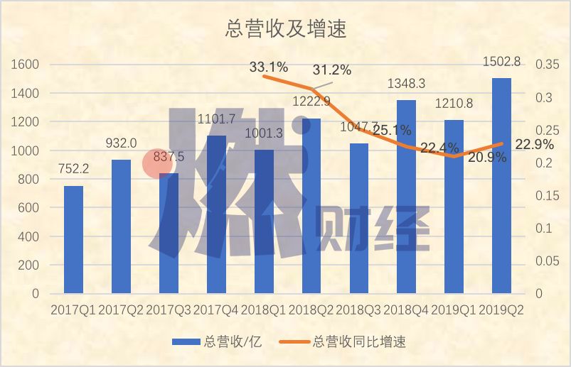 Q2财报第一大亮点是营收表现。单季度营收1503亿元,超出分析师预期,为历史单季最高。从增速来看,2018年Q3营收增速首次低于30%,自此之后一路下滑。如今,22.9%的增速虽然仍略显疲态,不过相对比Q1的20.9%已经有所回升。
