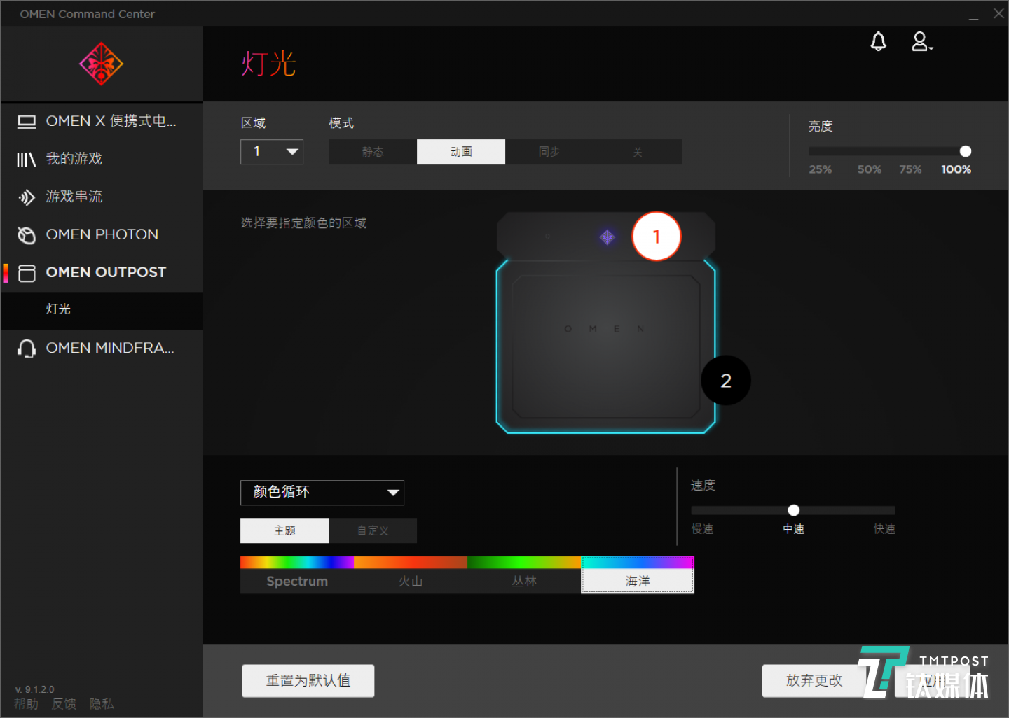OMEN Command Center 是万能的存在:它是所有连接上的暗影精灵系列外设的控制中心:玩家可以通过它,调节所有的灯光。1680 万种的颜色中,总有你喜欢的那款。实在举棋不定的时候,选个内置主题变幻色也不错。