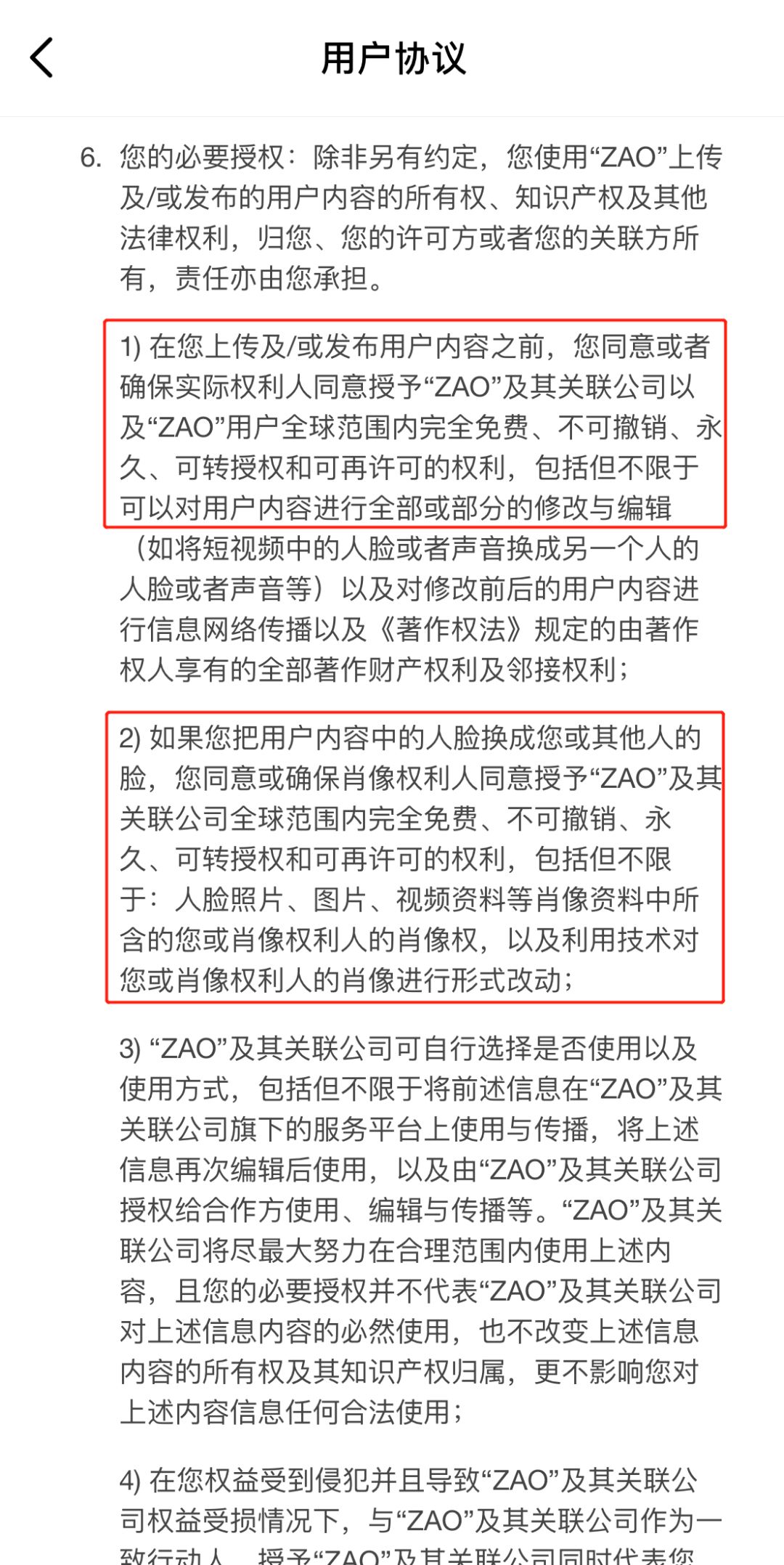首先,ZAO用户协议中包含的多项条款都有着巨大的法律风险。而使用ZAO换脸功能后(必须同意用户协议后才能使用),ZAO不光借此免费获得了上传资料中所包含肖像信息的使用权和转授权,还将侵权的风险转嫁给了用户。