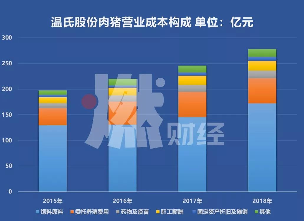 以温氏股份肉猪业务的营业成本为例,近四年来,其排名前列的支出为饲料原料、委托养殖费用、药物及疫苗、职工薪酬。其中,饲料原料占营业成本的六成,为绝对大头,委托养殖费用占比则在20%上下徘徊。