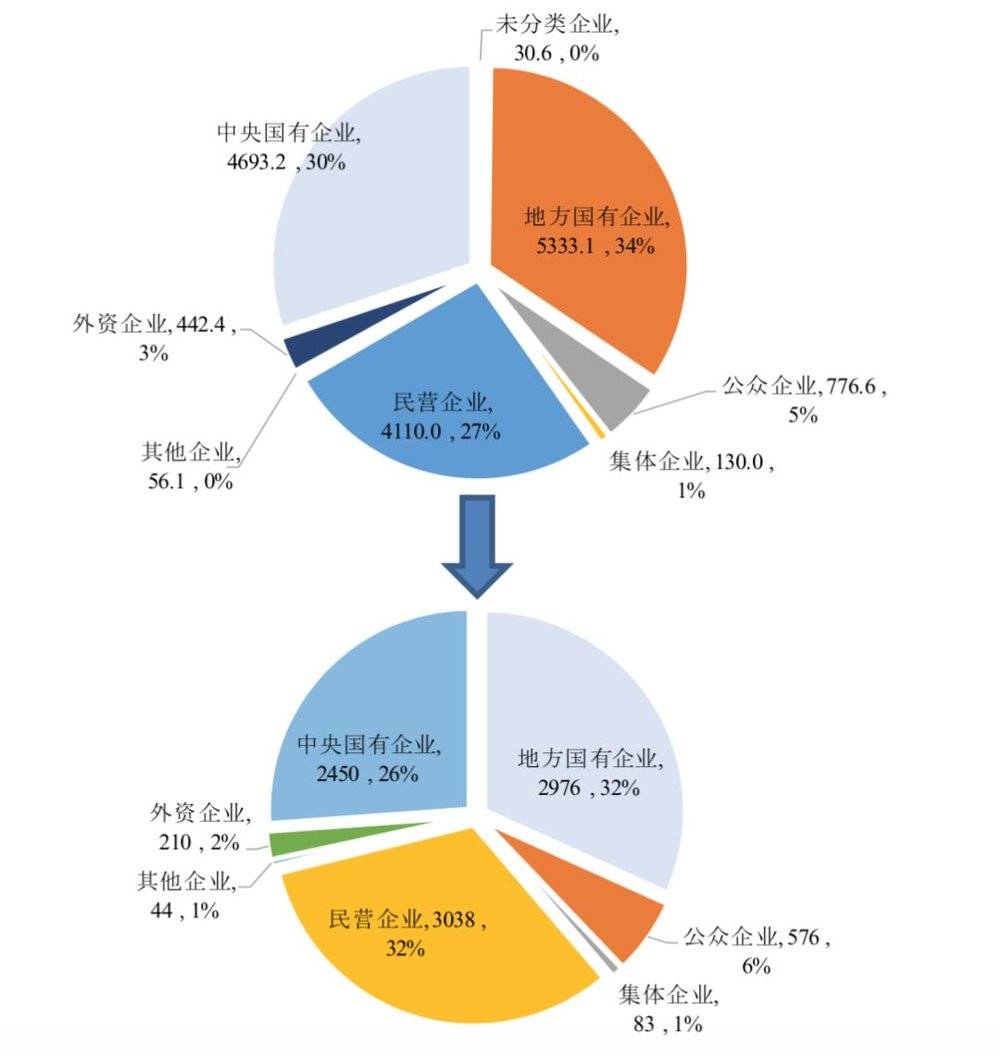其中,央企盈利占比从30%下滑至26%;地方国企盈利占比从34%下滑至32%;而民企的盈利占比从27%上升至32%。